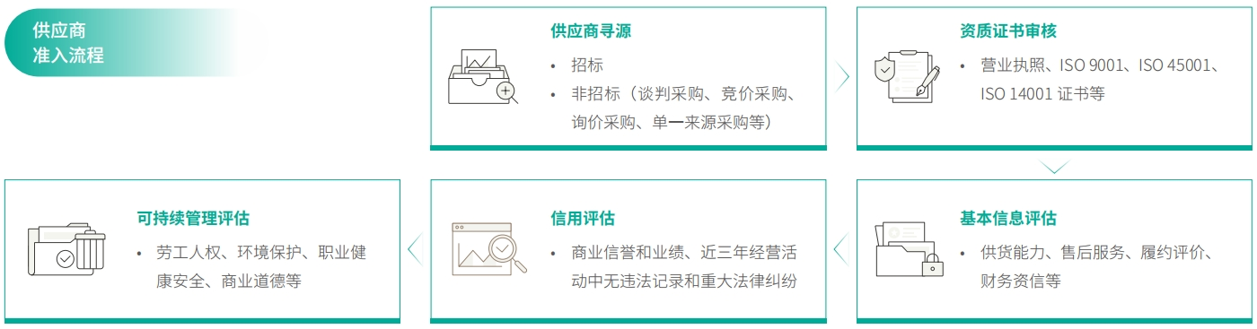公司实验供应商资质准入、可一连供应商准入评审和及格产品目录制治理,所有供应商必需经由资格审查方可进入及格供应商名录。我们关注供应商在可一连生长方面的体现,设置《供应商自评表》,约请供应商举行自我评估,针对焦点供应商开展现场审核、产品批量试用等,连系评估效果和调研、资格审核情形完成《可一连供应商准入评审》,划分ABC三个品级,评估供应商是否知足准入标准。