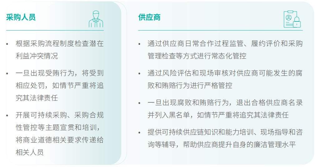 我们坚持“阳光采购”,要求所有供应商签署《供应商行为准则》和《供应商诚信清廉允许书》,并在采购条约中加入供应商清廉相关条款。同时在供应商准入、聘用、审核等多个流程中均对糜烂、行贿、利益冲突等违规行为提出规范要求。公司通过商业品德和供应商治理双重管控,对采购职员和供应商双向羁系,确保企业与供应商之间不爆发违反商业品德的往来。
